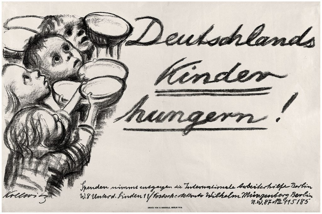 Doch auch sozialen Themen blieb sie stark verbunden und empfand es als tröstlich mit ihrer Kunst „zu wirken“. Hunger war eine zentrale, schwerwiegende Folge des Ersten Weltkrieges – nicht allein Deutschlands Kinder hungern. Auch in anderen Teilen der Welt hungerten die Menschen, worauf Käthe Kollwitz in ihren oft unbezahlten Auftragsarbeiten aufmerksam machen wollte: Helft Russland, Wien stirbt! Rettet seine Kinder! Auch für die Belange der Frauen setzte sich die Künstlerin immer wieder ein. Nieder mit dem Abtreibungsparagraphen! und Mütter gebt von euerm Überfluss zeugen von ihrem Engagement.