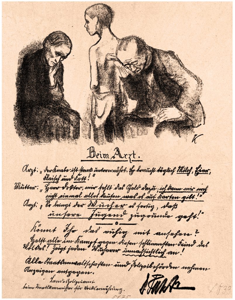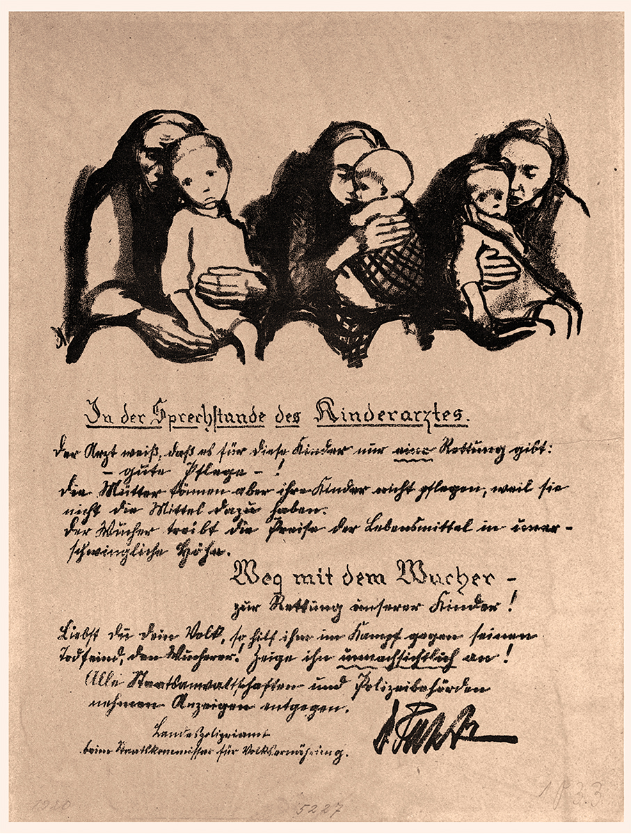 Doch auch sozialen Themen blieb sie stark verbunden und empfand es als tröstlich mit ihrer Kunst „zu wirken“. Hunger war eine zentrale, schwerwiegende Folge des Ersten Weltkrieges – nicht allein Deutschlands Kinder hungern. Auch in anderen Teilen der Welt hungerten die Menschen, worauf Käthe Kollwitz in ihren oft unbezahlten Auftragsarbeiten aufmerksam machen wollte: Helft Russland, Wien stirbt! Rettet seine Kinder! Auch für die Belange der Frauen setzte sich die Künstlerin immer wieder ein. Nieder mit dem Abtreibungsparagraphen! und Mütter gebt von euerm Überfluss zeugen von ihrem Engagement.