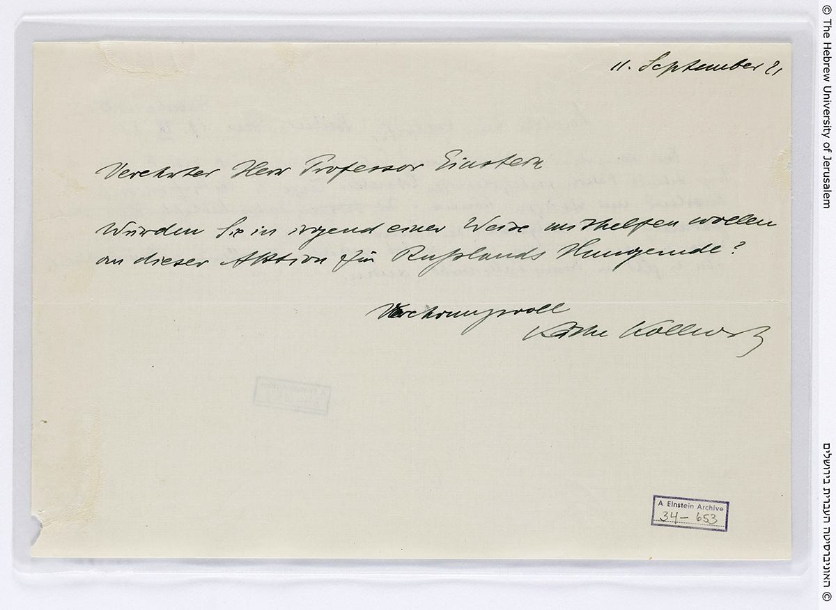 Albert Einsteins (1879-1955) Interesse weckte ein aus Kollwitz‘ Feder stammender Aufruf, der kurz vor Ende des Ersten Weltkrieges im sozialdemokratischen Vorwärts erschien. Darin forderte sie ein Ende der Kämpfe und schloss mit einem Zitat von Goethe, dass sie gegen Ende ihres Lebens als ihr Vermächtnis bezeichnen sollte: „Saatfrüchte sollen nicht vermahlen werden!“