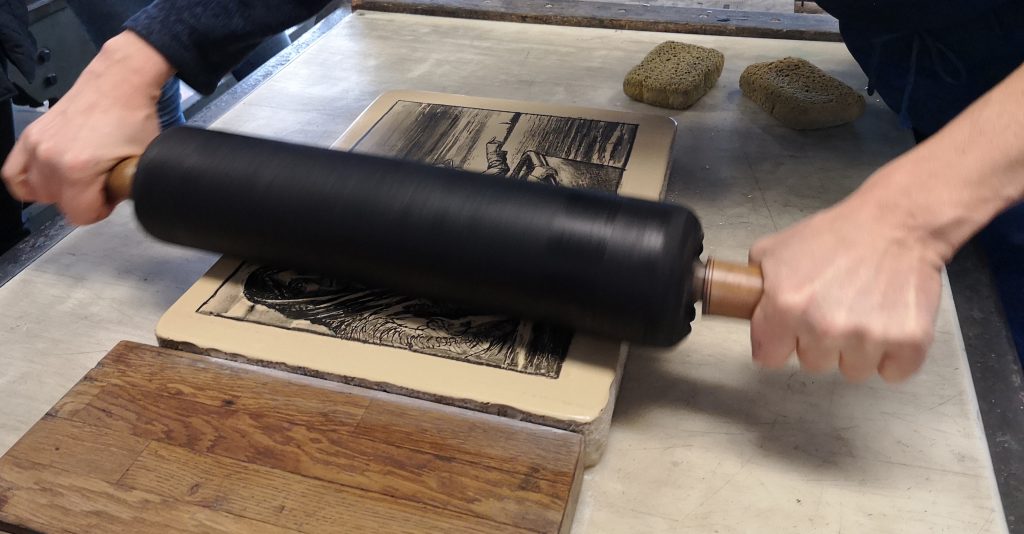 Nun beginnt der Druckvorgang. Dazu wird der feuchte Stein in die Handpresse gelegt und mit Druckfarbe eingewalzt. An den Stellen, an denen man gezeichnet hat, befindet sich viel Fett (wodurch das Wasser abperlt), und an den freien Stellen ist viel Wasser, weshalb die Farbe nicht haftet. Der Stein wird mit einem einem feuchten Blatt Papier und einer Schutzschicht aus Pappe abgedeckt, und das Pressen kann beginnen. Durch den enormen Druck saugt das Papier die Druckfarbe auf und es entsteht eine Lithografie. Für jeden weiteren Druck muss der feuchte Stein erneut eingefärbt werden.